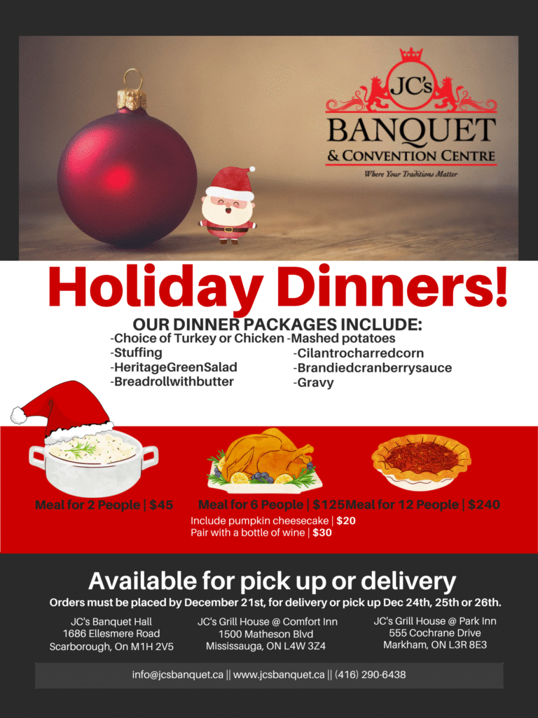 Call 416-290-6438 to reserve your Christmas dinner now!