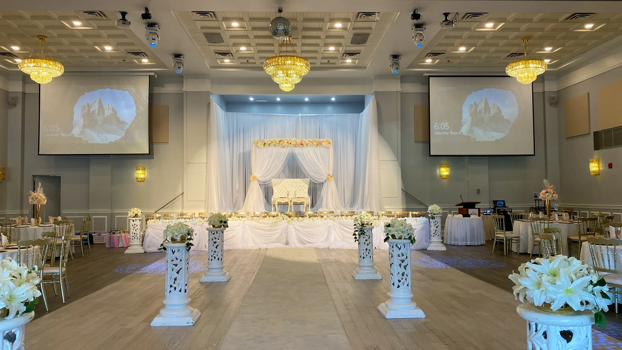 Our main hall has a capacity of 400 people. It can also be divided in three offering rooms for 100 or 200-plus guests. The space is flexible for any function needs with kitchen, washroom, elevator service and building entrance close at hand. With two-storey ceiling, optimized lighting and sound and dramatic chandeliers the room adds elegance to any event. This hall, elevator and washrooms facilities are fully accessible.